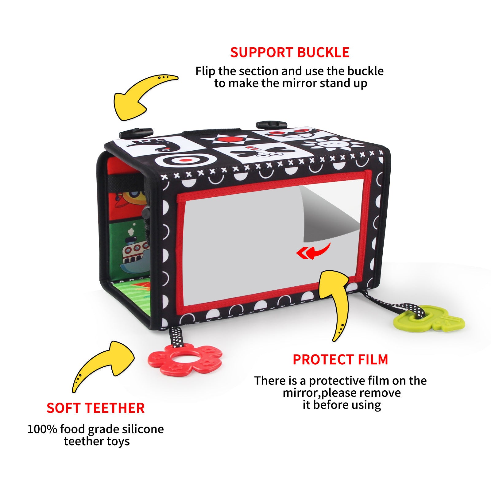 Engage Your Baby's Senses with This Interactive Mirror Cloth Book Captivate your little one's attention with this innovative baby mirror cloth book! Featuring a unique four-folding design with safe mirrors, this sensory toy encourages self-discovery, visual development, and tactile exploration while providing endless entertainment. Key Features: Safe Baby Mirrors: Shatterproof mirrors allow babies to discover their reflection safely Four-Folding Design: Versatile structure can be positioned multiple ways for interactive play Pendant Attachment: Easily hangs on strollers, car seats, or cribs for on-the-go entertainment Sensory Development: Stimulates visual, tactile, and cognitive development Soft Cloth Material: Gentle, safe fabric perfect for babies to touch and explore Lightweight & Portable: Easy to take anywhere for entertainment on the go ✓ FREE SHIPPING on all orders Perfect for babies discovering their reflection and exploring the world around them! This engaging mirror cloth book supports early development while keeping your baby entertained during playtime, travel, or tummy time.